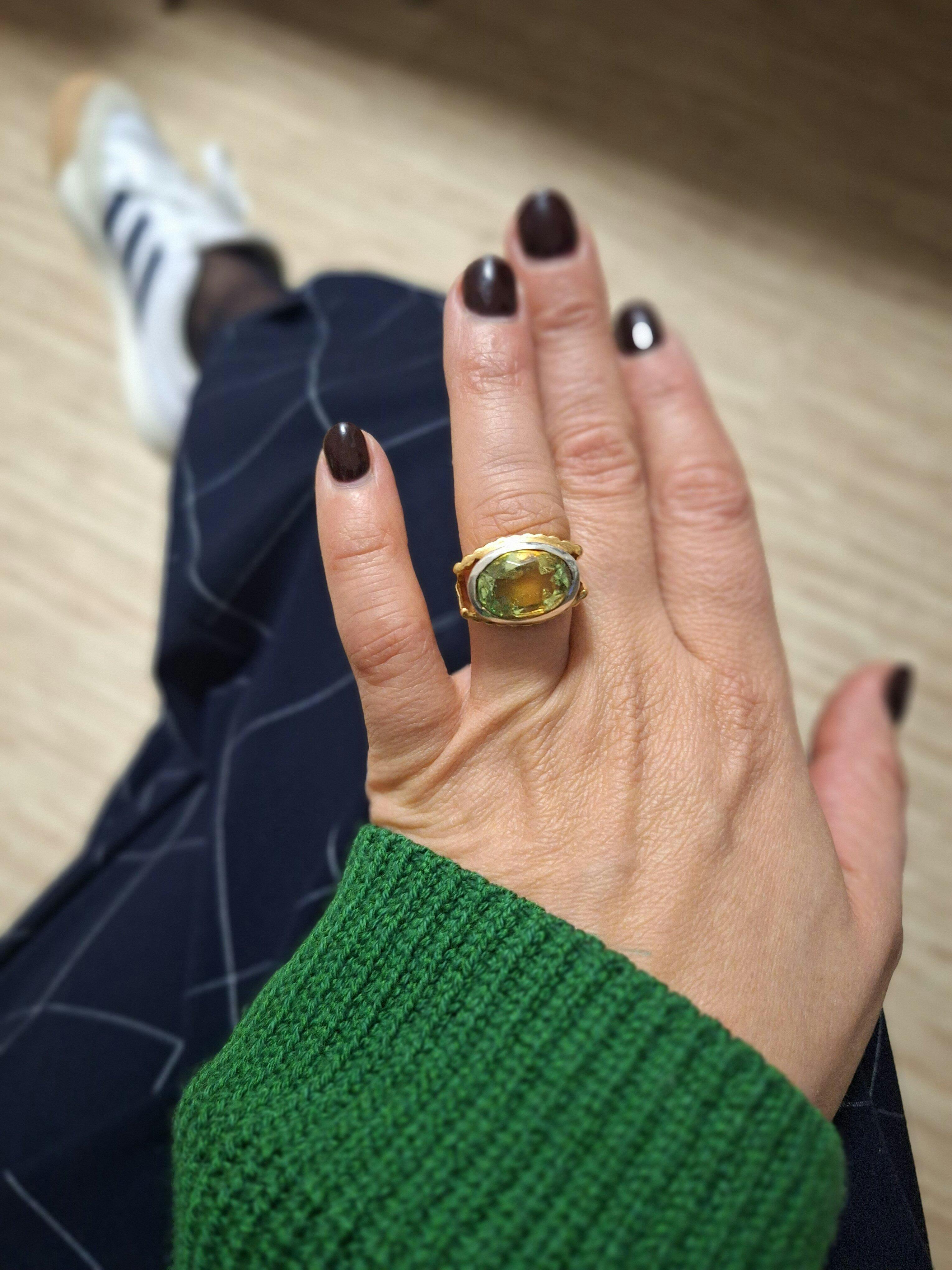 First, this stone will leave no one indifferent. A doublet of bi-colored green tourmaline with yellow highlights that will turn heads! It is as if suspended to be highlighted.