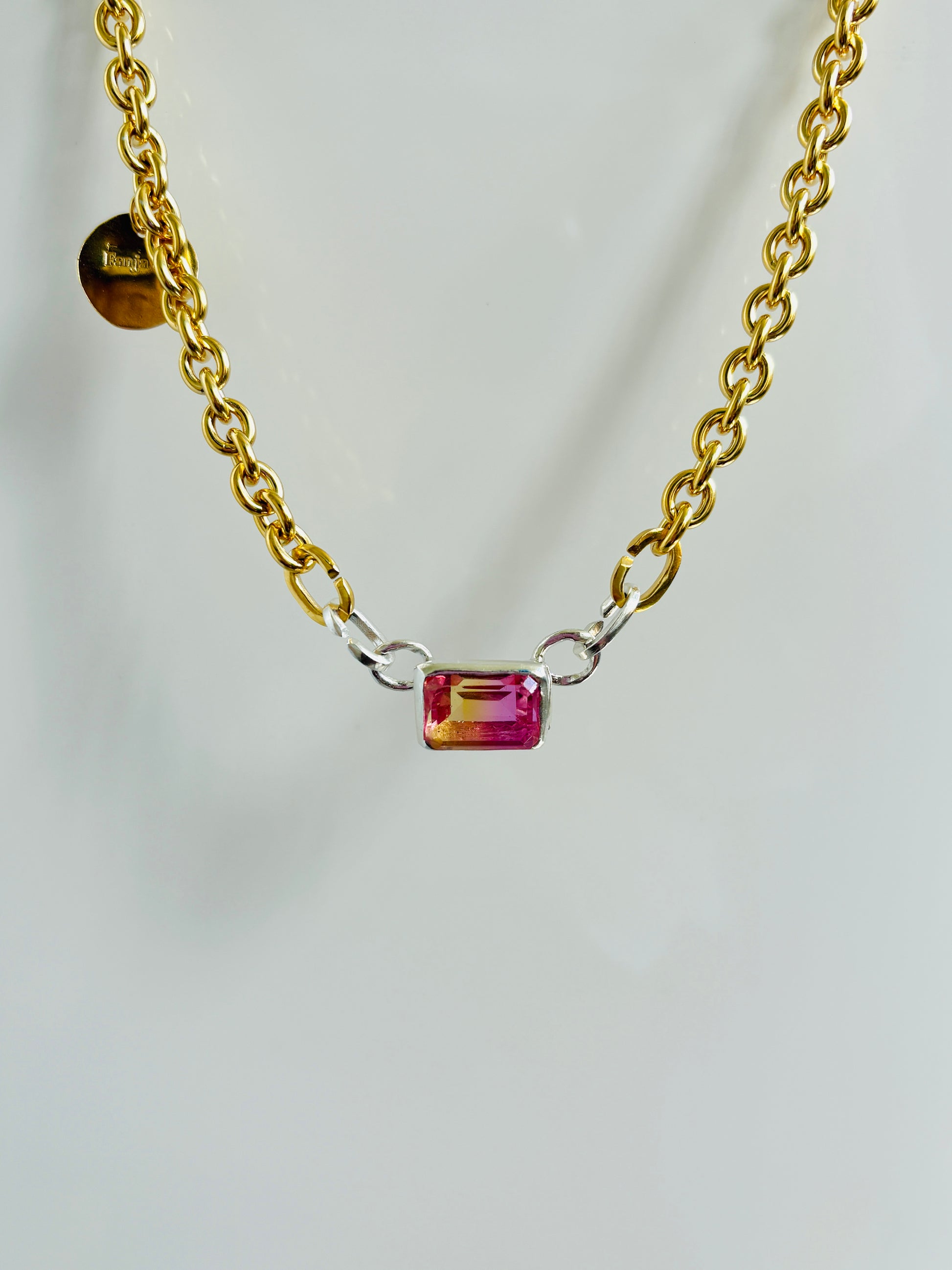 Une magnifique pierre rose avec des reflets jaune sertie sur une structure en argent et accrochée pas du tout au centre d’un shocker vermeil qui n’a absolument rien de classique.