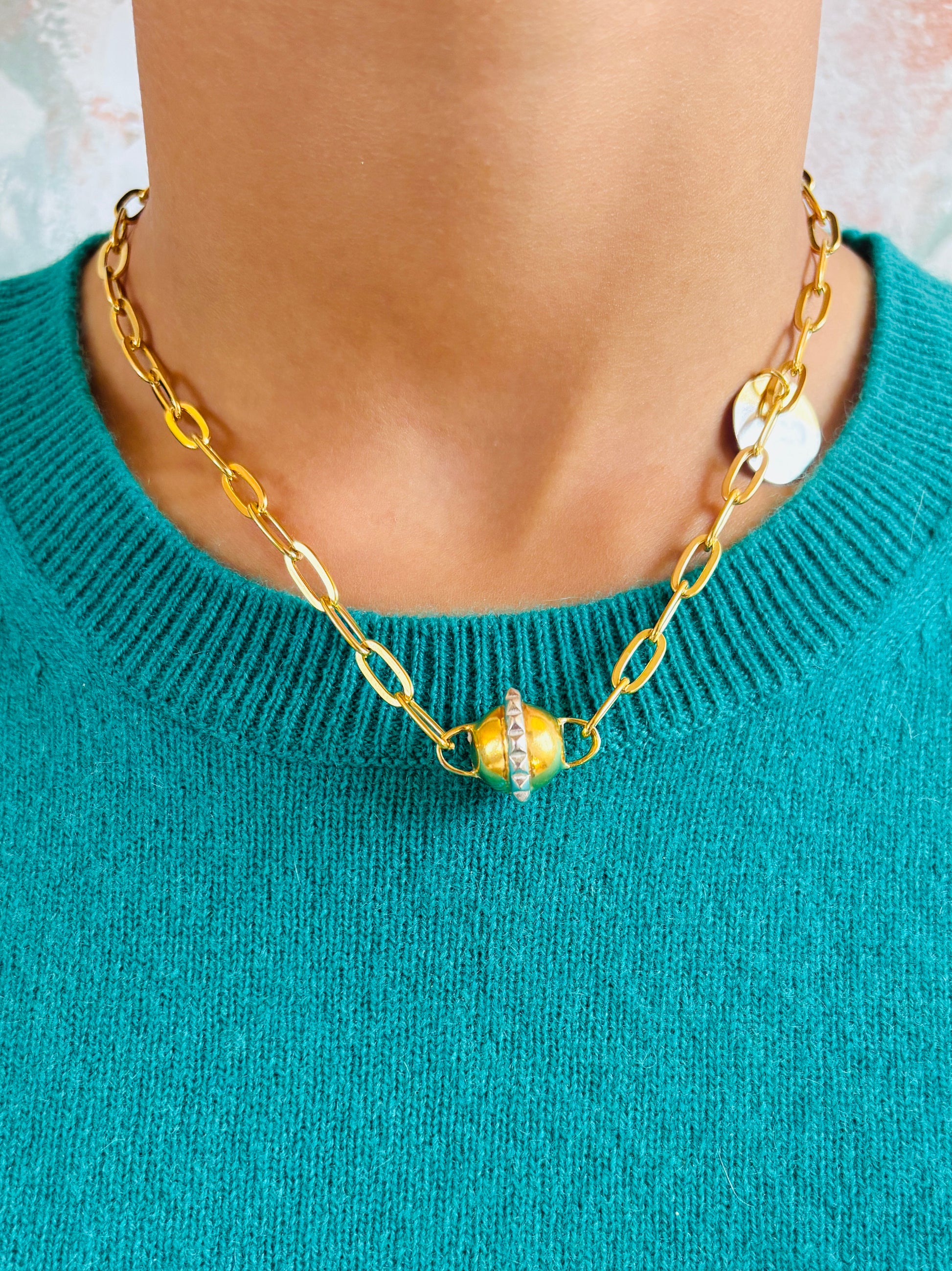 Il est composé d’une chaîne et d’une boule en vermeil entourée d’un anneau à clous en argent.