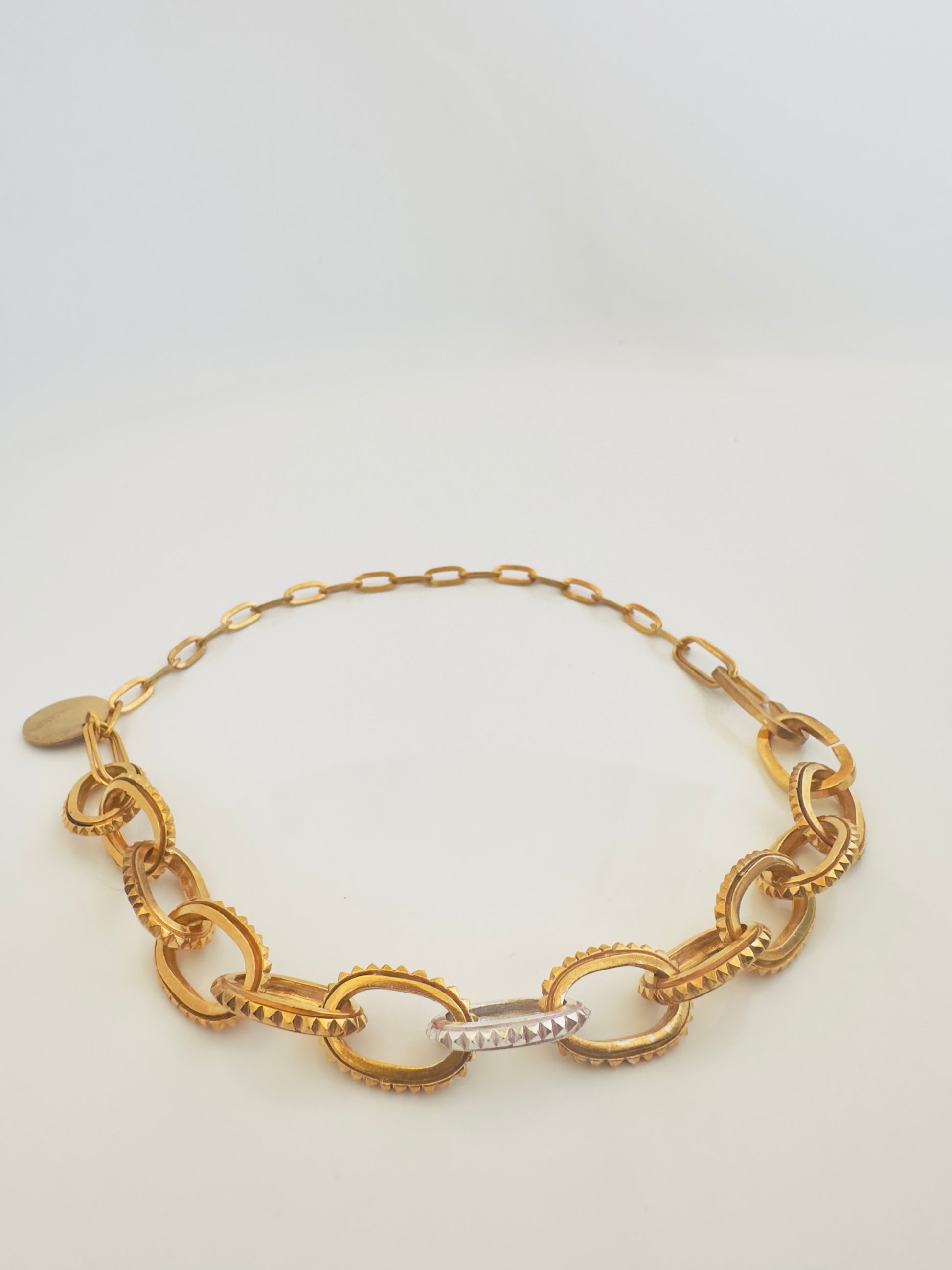 Le placage d’or 24 carats a été réalisé dans notre atelier en Normandie. Sa couleur patinée renforce l’identité très affirmée de ce collier bicolore.
